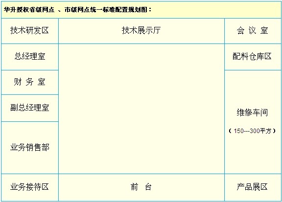 華升總部:負(fù)責(zé)形象策劃、管理、推廣、技術(shù)研發(fā)、技術(shù)支持、方案提供、設(shè)立大型配件倉(cāng)庫(kù) 省級(jí)網(wǎng)點(diǎn):省內(nèi)網(wǎng)點(diǎn)管理、工廠級(jí)維修、技術(shù)支持、技術(shù)考核、售后管理、配件批發(fā)等 市級(jí)網(wǎng)點(diǎn):市內(nèi)網(wǎng)點(diǎn)管理、工廠級(jí)維修、技術(shù)支持、技術(shù)考核、售后管理、配件批發(fā)等 特約維修站:區(qū)鎮(zhèn)內(nèi)業(yè)務(wù)承接、維修 保修、檢測(cè)配板、配件零售、售后服務(wù)等 |